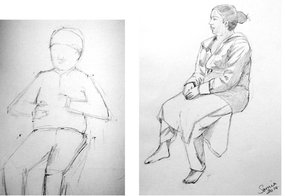 Shown at left is a student's drawing, at the start of the course and after two months' instruction.